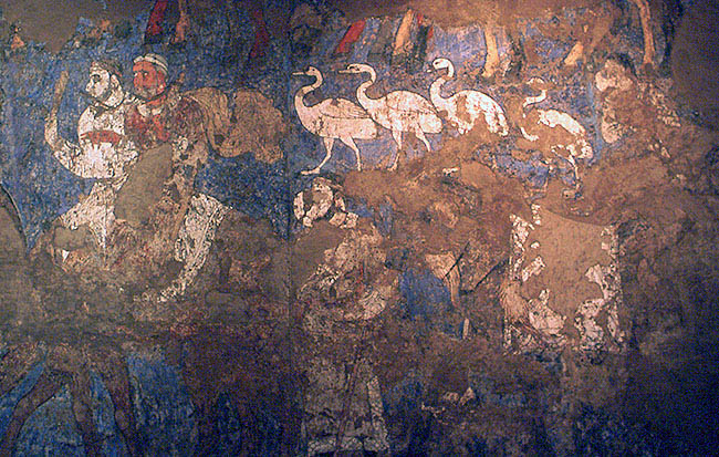 宮殿の大広間の南壁の壁画の一部、7世紀 丘のふもとのアフラシアブ博物館にて保存展示している。