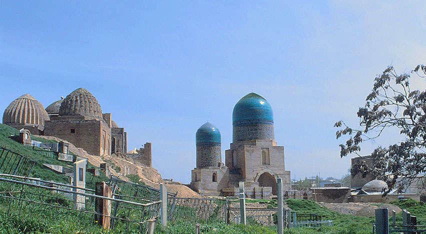サマルカンドのシャーヒ・ジンダ墓廟群を 西南より見る。 左がシャーデ・ムルク・アカの廟 1372 と アミールザーデの廟 1386、 中央が王母の廟(トゥイン・ドームの廟)、右端が モスクと南入口のピシュターク。