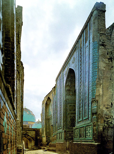 サマルカンドのシャーヒジンダ墓廟群(修復前)を 北から見る。 右がシャーディ・ムルク・アカの廟 (1372) と、アミールザーデの廟 (1386)。 奥がミドル・チョルタク門とトゥイン・ドームの廟、 (Photo from "Central Asia" Moscow, 1987)