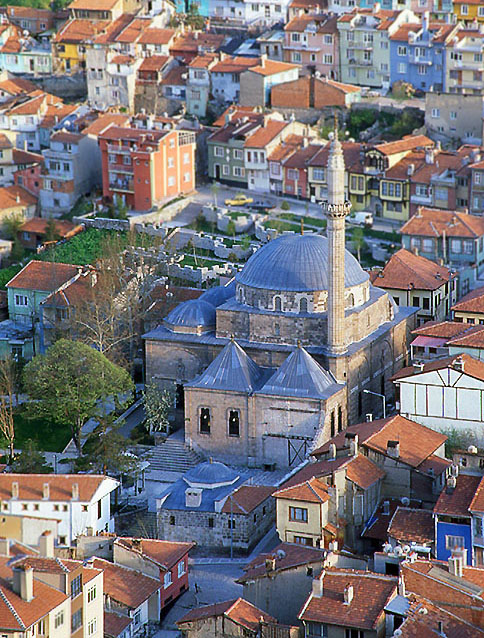 トルコの典型的な街並み、アフヨン トルコの民家は ほとんど常にオレンジ色の瓦で葺かれた勾配屋根で (雨が多い)、壁は白く塗装されることが多い。 モスクの曲面屋根は 展延性のある鉛で葺かれるので、常にグレーである。 (写真のモスクは 中規模の、単一ドームのメヴレヴィ・ジャーミイ、 鉛筆型のミナレットを1本備えるが、中庭はもっていない)