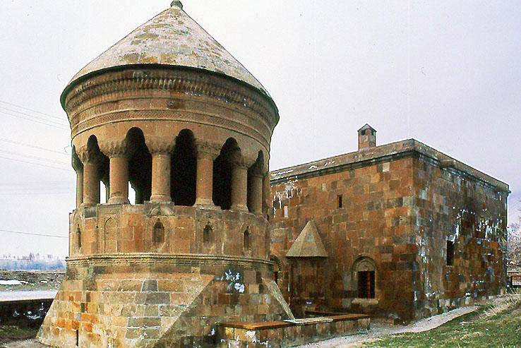 セルジューク朝の墓廟群のうち アミール・バユンドゥル・チュルベ、1492年、アフラト 円堂と陸屋根平屋の二棟から成り、円堂は 単列周柱堂という珍しい形をしている。 建築家は アゼルバイジャン出身のバーバー・ジャーンと刻まれている。