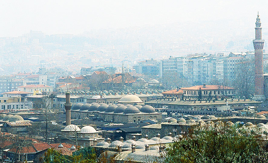 ブルサ旧市街の商業施設群(ハ-ン、べデステン、チャルシ) 小ドームが連なる建物が多く見られるが、どれもハーン(キャラバンサライ)や ベデステン(屋内マーケット)である。ここが首都ブルサの商業中心をなしていた。 中央の建物がべデステン、右端のミナレットが ウル・ジャーミ。