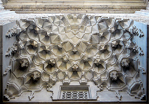入口イーワーンの天井見上げ。トルコのムカルナス天井は、 ペルシアと違って石造なので、「張りぼて」ではない「 構造体」である。