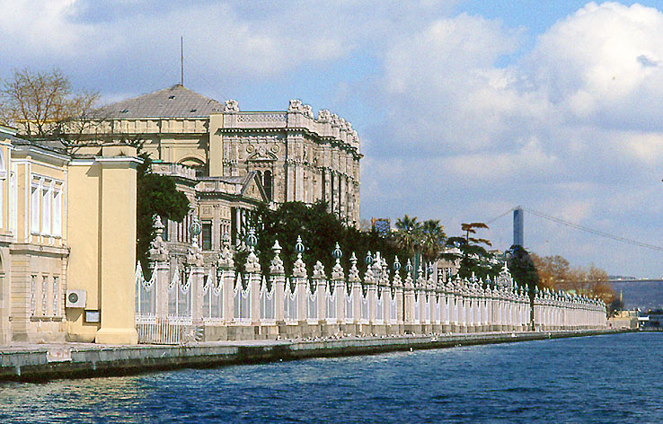 イスタンブルの ドルマバフチェ宮殿をボスフォラス海峡から見る。