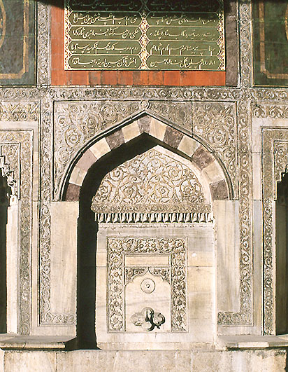 吐水口まわりの壁面の 繊細な石彫装飾