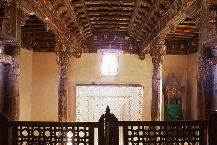 2階の女子用礼拝室からミフラーブを望む。右手に木造のミンバルが見える。