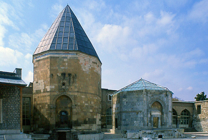 コンヤの アラー・アッディーン・モスクの中庭 左がクルチ・アルスラン2世の廟(キュンベット)で、1170年代と推定される。 10角形のイラン=アルメニア風塔墓で、レンガ造の角錐屋根の金属板仕上げは現代のもの。右は未完成の廟