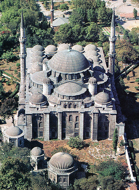 イスタンブルの シェフザーデ・ジャーミイ(王子のモスク) サミ・ギュネルの撮影による鳥瞰写真、手前は王子メフメトの廟 背面から見ているので、中庭は ちょうど大ドームで隠れている。 (From "Sinan, Architect of Ages" 1988, photo by Sami Güner)