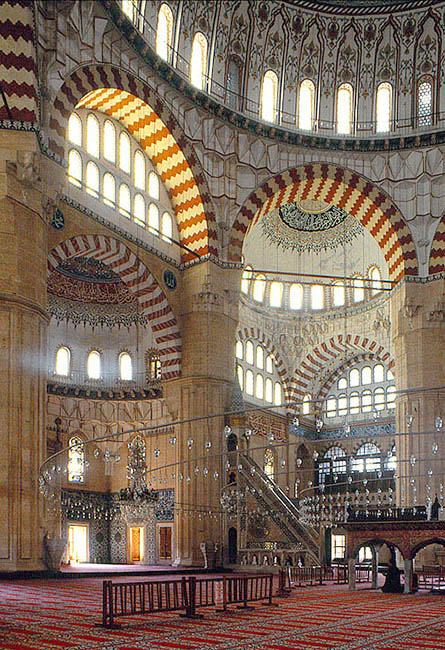 セリミエのモスクの内部、左手が ミフラーブ、その右側に ミンバル(説教壇) ドームを支える 8本の柱以外には、直径 32mの大空間内に 1本の柱もない。 大小のアーチとドームが対位法的に絡みあうフーガのような、幾何学的で宇宙的な礼拝室。