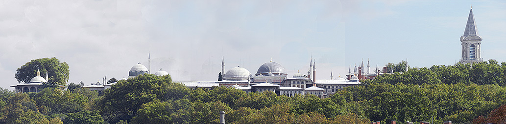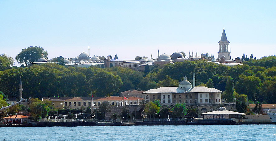 ボスフォラス海峡の船上から眺める トプカプ宮殿、イスタンブル 丘の上がトプカプ宮殿群で、右端が 司法の塔 、中央がハレムの大広間のドーム、左端のドームが バグダード館。 右下の大きな建物は、セペトチレル・カスル Sepetçiler Kasri と呼ばれる、かつての宮殿。