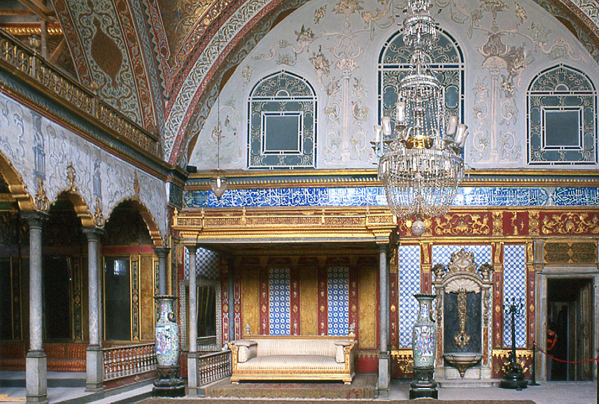 トプカプ宮殿のハーレム、イスタンブル(トルコ) ハーレム内、スルタンの大広間 1585年の創建だが、 1755年以来の数次の改修で、創建時の装飾は残っていない。 The Sultan's Hall in the Harem of Topkapi Palace, Istanbul, Iran First built in 1585, numbers of reformation leaves no original decoration.