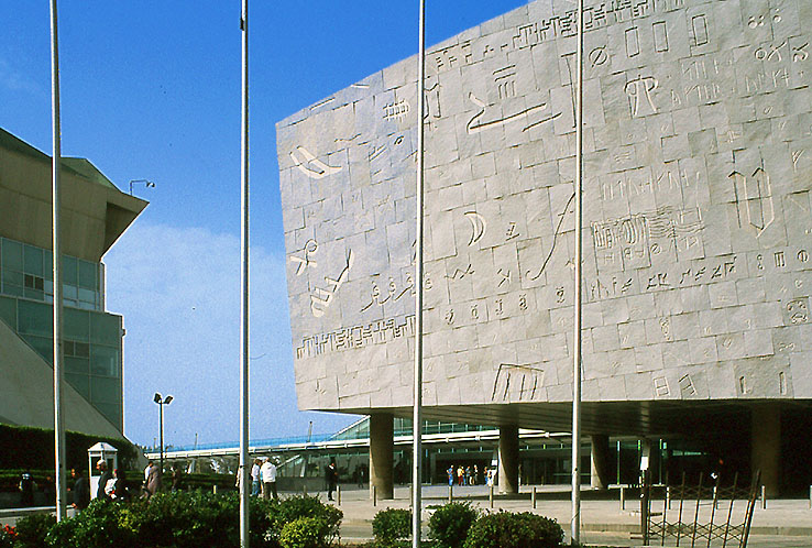 アレクサンドリア図書館 三次元にカーブした外壁には、古代エジプトのファラオ文字や、種々の古代言語の文字が刻まれている。 図書館本体は、この地下 10層に展開する。 左は国際会議場、ほかにプラネタリウムがある。