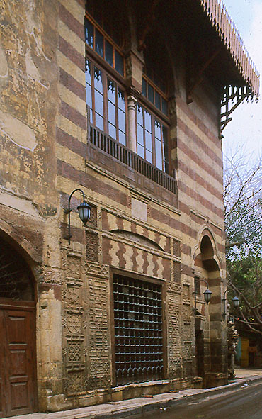 アリー・アーガーの サビール・クッターブ、カイロ(エジプト) 1階のサビ-ルの格子はブロンズ製。左の入口は アミール・ターズ宮殿の通用口。 2階がクッタ-ブ(寺子屋)で、右側の入口の奥に階段がある。 上階のクッターブは今も小学校に使われている。