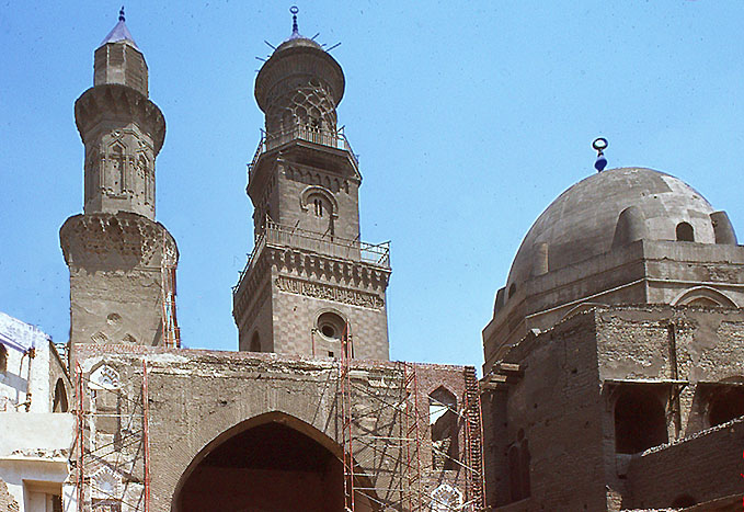 スルタン・ムハンマド・アンナーシル廟+学院 複合体の中庭 修復工時中(1986年)のイーワーン。中庭のこの面とミナレット(左手)しか残っていない。 中央のミナレットと右手のドームは、カラーウーン学院のもの。