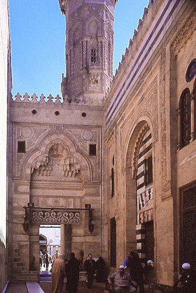 アズハルのモスク、カイロ アル・ムザイニーン 門を入ると、屋根のないエントランス・ホールのようになっていて、 左右にマドラサがあり、正面に ミナレットを従えた 1495年のカーイトバーイ門がある。 この門の奥に 広い中庭が広がり、このすぐ左右に さらに2本のミナレットがある。