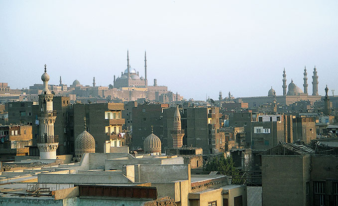 左遠方に見えるシタデル(城塞)と、その下のカイロ市街 トルコ風のムハンマド・アリーのモスクが、シタデルのシンボルになっている。 ズワイラ門のミナレットからの望遠。 右遠方に見えるのは リファーイーのモスク。