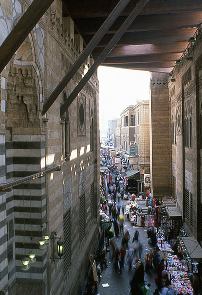 イスラーム地区の最も繁華な通りを隔てて、アル・グーリーの廟(左)と