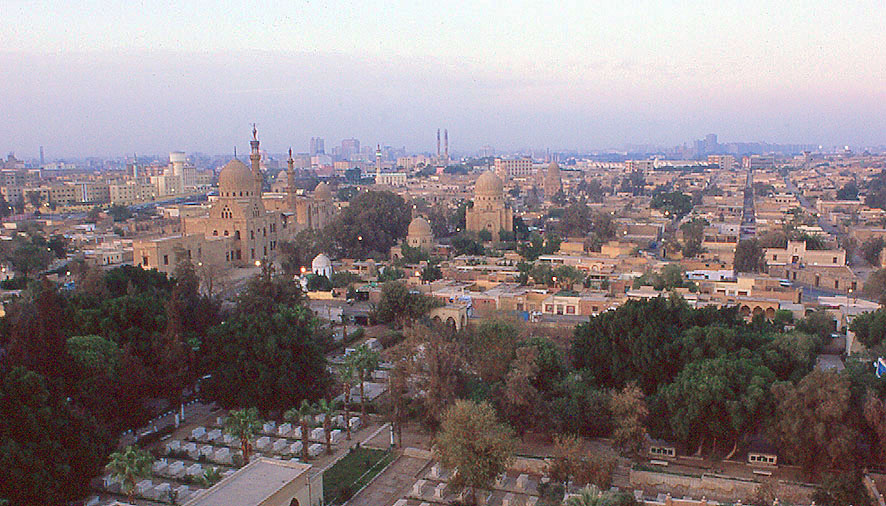 カイロ北方の「死者の町」(巨大墓地公園)を、ファラジュ廟の屋上から眺める。