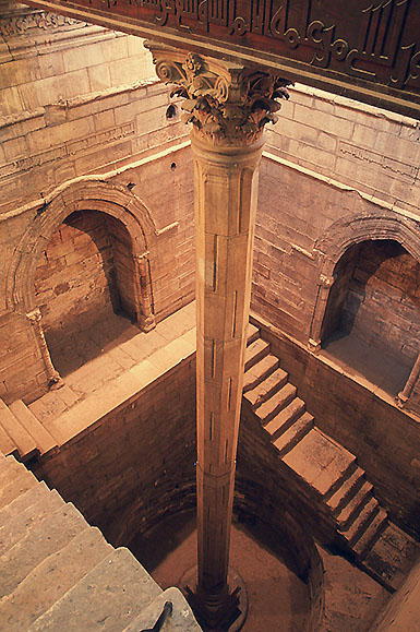 ローダ島の ナイロメーター、861年、カイロ(エジプト) 中央の柱に刻まれた目盛りで、ナイル川の水位を測った。 今は水が引かれていず、周囲の階段で最下部まで降りられる。