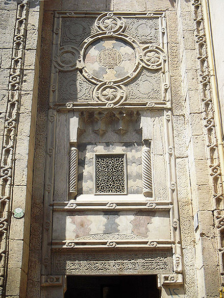 入口上の石彫装飾。この奥に階段があり、寺子屋に上がる。