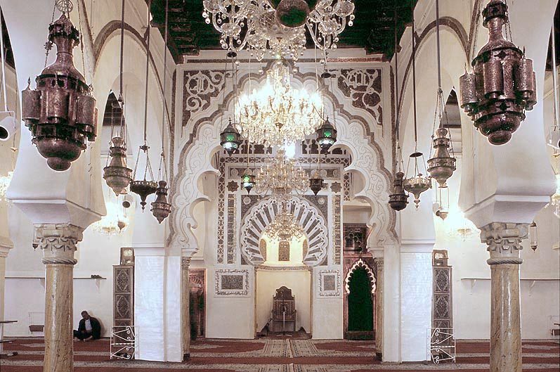 トレムセンの大モスク内部、アルジェリア シャンデリアの数が増えて、ますます飾りたてられた中央部 ミフラーブの右側にはミンバルが格納されていて、必要なときだけレールの上を滑らせて引き出す。 ミフラーブの左側はイマームの部屋へのドア。 右側と大きさが違い、左右対称性が崩れている。 ミフラーブ室の中央に、誰が座るわけでもないのに、椅子が置かれているのが特色。 「ムハンマドの 座」ということだろうか。