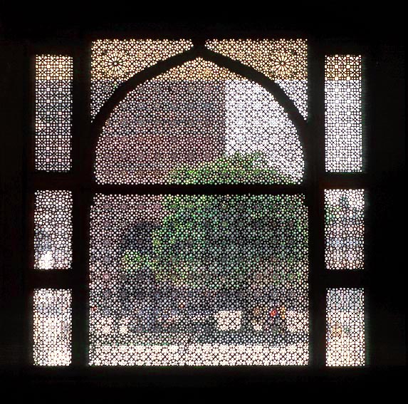 白大理石のスクリーンによって、外の風景が透けて見える。
