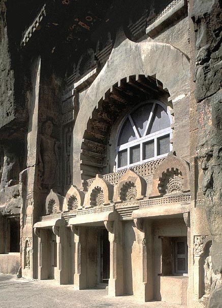 Facade of Chaitya Cave 9, Ajanta, 1st century B.C.E. A wooden frame and metal net were later inserted in the Chaitya window to keep out of birds and bats.