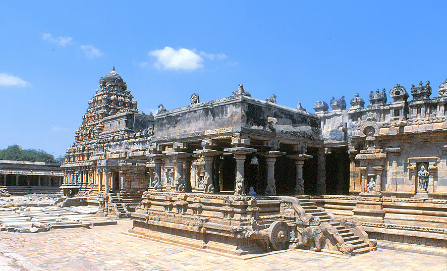 The Airavateshvara Temple in Darasuram, mid-12th century. Though its scale is much smaller than Thanjavur and Gangaikondacholapuram, the elaborateness of its sculptures is rather higher than the others'.