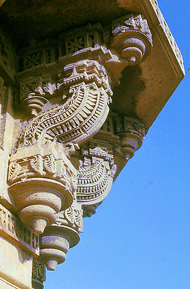 The details of brackets supporting a minaret balcony of Bibi-ki-Masjid Its Hinduistic carvings are extremely fleshy and luxurious, unlike any other countries' minarets.