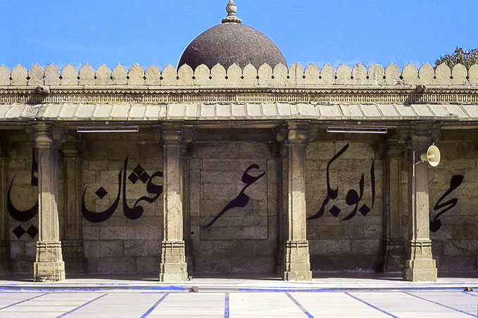 Pillared corridors (Dalans) surrounding the courtyard of the Jami Masjid, Ahmadabad The wall of each span is painted with gigantic calligraphic Arabic letters.
