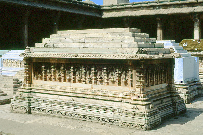 The cenotaph of Queen Bibi Mughali, 1445, the wife of Muhammad Shah II and the mother of Mahmud Begada, who constructed Champaner and Sarkhej. It centers the enclosure of the Queens' Tombs encircled with screened cloisters.