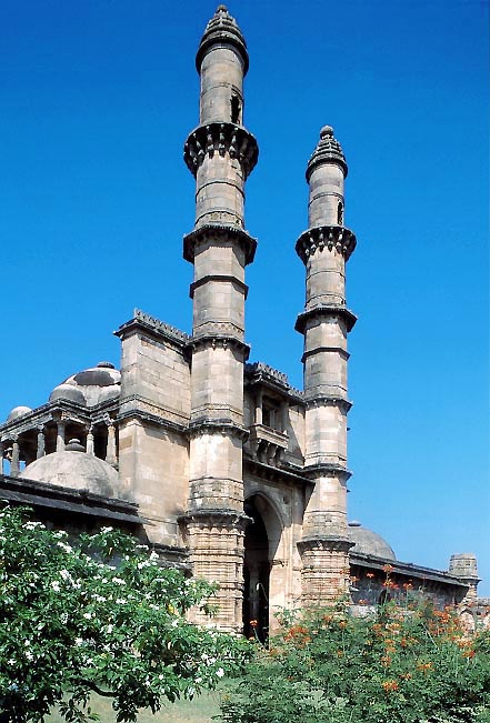 The central part of the worship hall of the Jami Masjid, Champaner, 1508. Though the lower parts of the Minarets are abundantly carved like Hindu temples, their upper parts have hardly any decorations.