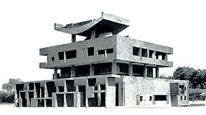 配置図の5番の州知事公邸は、ル・コルビュジエがかなり設計を進めて 基本設計図と模型(上)を用意した。建物の背後には 知事のための庭園も マスタープランに盛り込んだが、知事公邸は基礎工事をしただけで中断してしまい、上部構造は実現しないことになった。ル・コルビュジエは最晩年に、その基礎の上に まったく別の施設、「知識の博物館」 (Museum of Knowledge) を建てることを構想し、模型(下)まで制作したが、これも実現の当てはない。(このデザインで実現しても、もはや世界の建築家の興味を集めることも ないだろうが。)