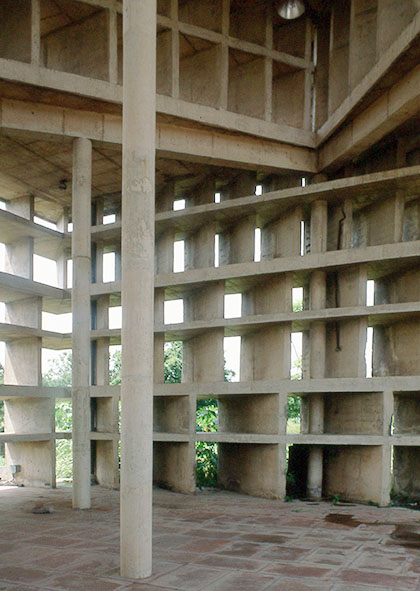 ル・コルビュジエの没後に建てられた 日陰の塔(トゥール・デ・ゾンブル)、内部、1968年 日時計のように 太陽の影の軌跡を記録してブリーズ・ソレイユの位置を決定する装置だというが、 むしろチャンディーガルの暑さを避ける「安息所」として機能している。