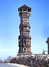 キールティ・スタンバ(名誉の塔) 世界の石の塔の中でも この塔が大きな魅力を見せるのは、その造形力であろう。組積造の高い塔を建てるというのは 構造的に容易でないから、たいていの塔は ただ構造体をそのまま表した単純な形をしているのに対して、このジャイナ教の塔は 周囲一面に ジナ像などの彫刻がほどこされ、胴がくびれたり張り出したり、ニッチやバルコニーで陰影をつけたりと、きわめて複雑な構成をしていて、一種表現派風な、類を見ない造形となっているのである。