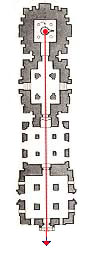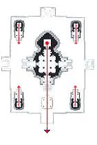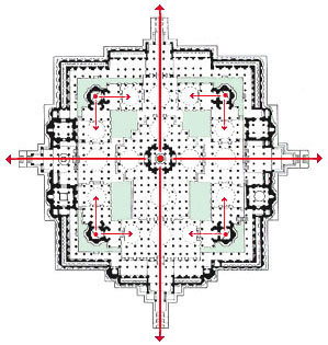 (図面 3) に示すのはアンコール・ワットの第2回廊から内側であって、この外側には 第1回廊がある。第2回廊の規模は約 100m× 120m(*5)であるが、その構成は ジャイナの理想プランと たいへんによく似ている。しかも、アンコール・ワットの中央祠堂もまた 四面堂であった、ということに気がつくのである。つまり、四方に広がる大規模な寺院計画では、その本堂がチャトルムカ的であることが 必然的に要請されてくる。