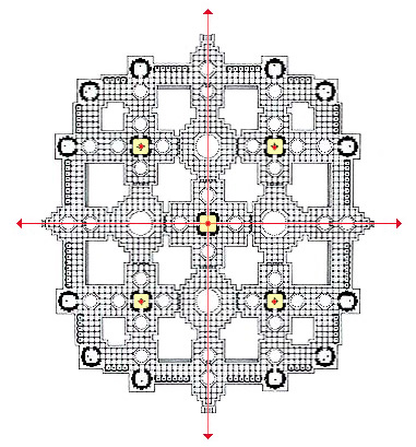 寺院は大規模で(図面1)、全体が 60m× 62m(*1)の、まるで要塞のような基壇の上に建ち上がり、中央の入口階段の上には3層の「バラーナカ」(エントランス・ホール)が、ドーム屋根を戴いている。 前回説明したような 防御姿勢で、入口の扉は小さめである。これをくぐって なおも暗い階段を登ると、不意に 明るい大空間が劇的に現れ、その華麗さには 思わず息を飲む。