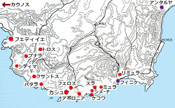 ミュラのネクロポリスと摩崖墓群 リュキアは 英語ではリシア LYCIA、トルコ語ではリキア LIKIA と言うが、美術史では ギリシア語読みの リュキアと表記するのが慣例なので、ここでも それに従う。したがって ミラではなく ミュラ、リミラではなく リミュラ、フリギアやフリジアではなく フリュギアと表記する。 リュキア王国とはいうものの、前4世紀頃には 古代ギリシアのような都市国家の連合体であったらしく、それを「リュキア同盟」と呼んでいる。プリニウスによれば 当時 36の都市が加盟していたと言い、最大の都市が クサントスであった。リュキア人は独立心が強く、アナトリアではローマ帝国に組み込まれた 最後の地方である。 今は どの都市にも 民家や宮殿址は残っていないので、見ることのできるのは アクロポリスの上の城址、ローマ時代の野外劇場、ビザンチン時代の聖堂跡 などであるが、リュキアの建築を最もよく伝えるのは、山の斜面に設けられたネクロポリス(死者の都、墓所)である。