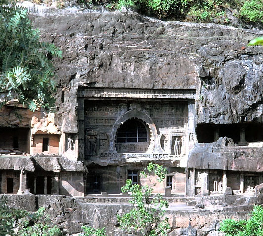 ブータ・レーナ窟(No.26)のファサード、ジュンナール(インド) 4本柱と梁のフレームから成る ファサードの奥の壁に、チャイティヤ窓がある。 アジャンター石窟寺院群、第26窟 柱と梁状の四角いフレームのファサードの中に チャイティヤ窓がある。