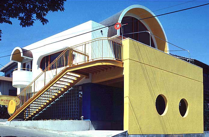 道路側のカラフルな外観。 2階のテラスへは、ゆるい外階段で上る。
