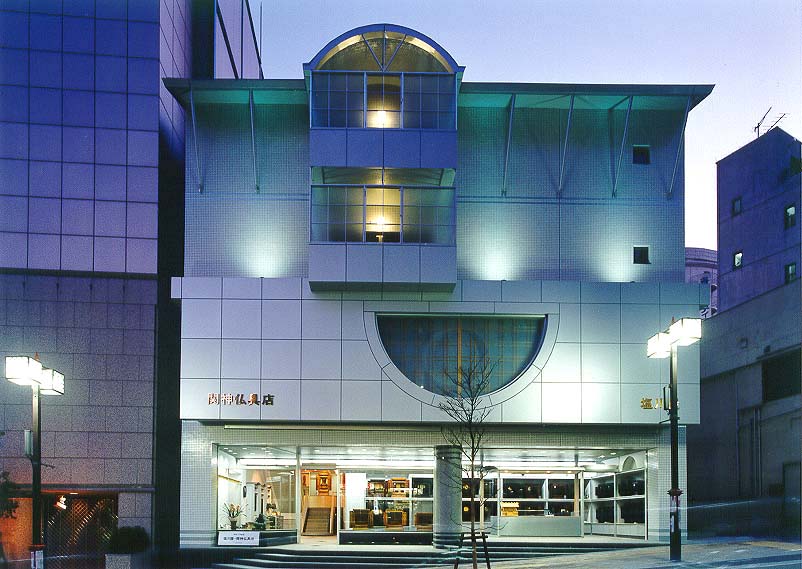 正面外観の夕景。 下2層が店舗で、上2層がオーナーの2世帯の住居。
