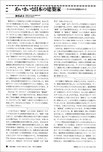 1995年7月号 特集「建築家・そのあるべき姿とありうる姿 」 神谷武夫 ヨーロッパで形成された アーキテクチュアという抽象的概念と、それを体現する アーキテクトというプロフェッションは、明治以降、我が国にも移植されてきました。 ところが日本には そうした伝統がなかったために、それらの概念は正しく理解されず、本来の理念とは異なった、あいまいな形に定着されてしまいました。 そのプロセスと現状を、主としてアーキテクトの訳語の変遷を通して検証し、その打開を提言します。 これで、 プロフェッション、アーキテクチュア、アーキテクトの「 翻訳論3部作 」が 揃うことになりました。