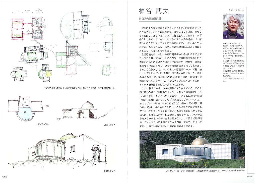 言葉による覚え書きやスタディがメモで、図や絵によるものをスケッチと言うのだと思う。言葉によるものは、整理して書き直し、あるいはパソコンに打ち込んでしまうと、まず保存しておくことはない。ところがスケッチの場合には、清書したあとでもアイデアそのものの形象化として、あとで見直すこともありうるし、また早書きの絵画作品のような趣もあるので、残されるものもある。 > 私は原稿を書くのに、ある時期は初めから終わりまで全てワープロを打っていた。ところがワープロは漢字変換という作業があるために思考の流れと手の動きが一致せず、文章が生硬なものになったり、思考の発展が妨げられてしまったりするような気がして、いつのまにか原稿はワープロで打つ前に、まずスピーディに(乱暴に)手で書く習慣になった。設計の場合も同じで、製図用具やCADを使う前に、最初は手に鉛筆を持って、フリーハンドでスケッチを描くというのが、アイデアを展開するには一番よいのだろう。 ここに載せるのは、小さな別荘のスケッチである。この計画を始める前に『楽園のデザイン−イスラムの庭園文化』という本を翻訳したところだったので、イスラムの幾何学性と「囲われた庭園」というコンセプトが頭にこびりついていた。そこでプランは5m×5mの正方形を3つ並べ、その間に「囲われた庭」をはさみ込むことにし、そのさまざまな配列をスタディしていた。プランの進展とともに立体的なスケッチも描くが、じきにスタディ模型を作り始めるので、パースのようなスケッチというのはあまり描かない。この設計では初期の、ごく小さなメモ用紙のスケッチが残っていて、こうして見ると、竣工写真とほとんど違いがないようである。
