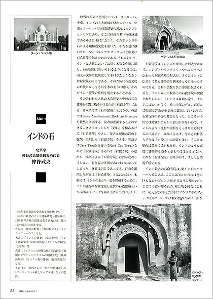 ● 関西の建築関連団体に「日本建築協会」というのがあります。大正 6年に「関西建築協会」として設立された、90年の歴史をもつ老舗団体です。 当初は 関西の建築家を大同団結しようとする組織でしたが、次第に 広く建築・建設関係のゆるい団体となったようです。その機関誌『建築と社会』の7月号が、「建築と石」という特集をしています。執筆者は、長尾重武、三宅理一、神谷武夫、渡辺明次、倉片俊輔、竹内良雄、新見隆、黒田龍二の諸氏です。私は「インドの石」と題して、インド最初の石窟寺院であるバラーバル丘の石窟寺院と、タージ・マハル廟などの白大理石のドーム屋根について書きました。
