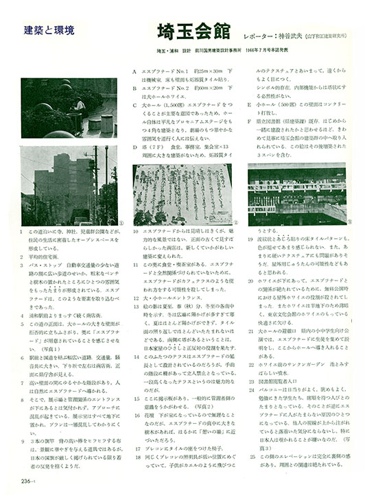 『 新建築 』 1972年1月号、236ページ 『 新建築 』 1972年1月号、237ページ A:エスプラナード No.1 C:大ホール(1,500席) D:事務所塔(7F) B:エスプラナード No.2 E:小ホール(500席) F:県立図書館(既存) 『 新建築 』 1972年1月号、238ページ 『 新建築 』 1972年1月号、238ページ 評論 拡大 『 新建築 』 1972年1月号、239ページ 評論 拡大