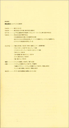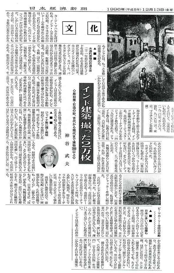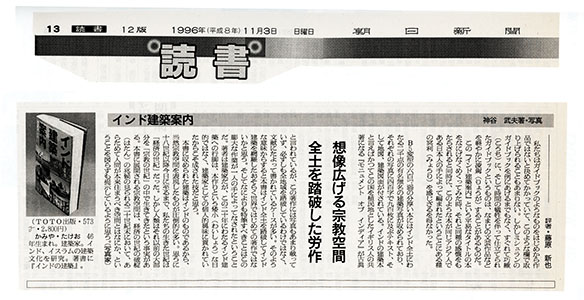『芸術新潮』 1996年12月号 p.143 インドの建築といえばイスラムの白亜の霊廟タージ・マハルか、妖艶なヒンドゥ彫刻で名高いカジュラーホの寺院か?そんな代表的遺跡は、実はこの国の豊穣な建築史のほんの一端に過ぎなかった! それを目の当たりにさせるのが、建築家・神谷武夫が 20年に及ぶ調査行の末に自らの写真と文とで刊行した『インド建築案内』だ。 612の重要物件を、1800点ものカラー写真と 300点余の地図・図面で紹介。日本の神社や天守閣に酷似したヒマラヤ地方の木造ヒンドゥ寺院、ピンクに統一された 18世紀の計画都市ジャイプルなどなど、ページをめくるごとに「インド文化とはかくも多種多彩だったか!」と驚かされる。実体験に基づく旅行ガイドも添え、門外漢も思わず机上の仰天建築旅行へ引き込まれる一冊なのだ。