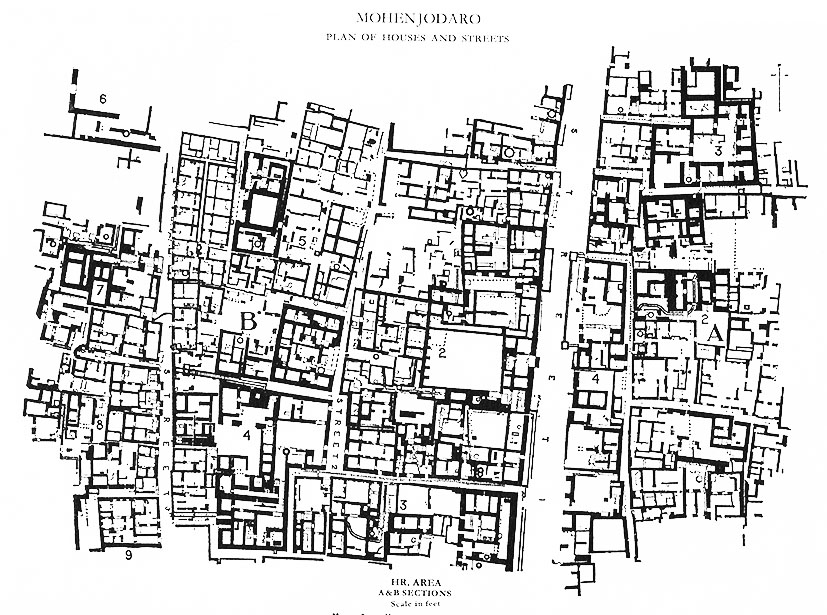 モヘンジョ・ダーロのHR地区 発掘平面図 大通りから細街路までの道路システムが、ほぼグリッド状に造られていた。 自然発生的都市ではなく、計画都市であることを示している。 (From "Architecture and Art Treasures in Pakistan" by F.A. Khan, 1969, Karachi)