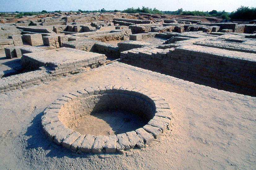 モヘンジョダーロ HR地区の住宅群 市街地区の各住戸は、中庭のやや外壁に近いところに井戸をそなえていることが多く、 円形に焼成レンガレンガを積んで造られていた。 厚い壁に守られた建物群の中には 工房か店舗と思われるものも見られる。 大通り側の壁面には開口部がなく、入り口は小路側にあった。