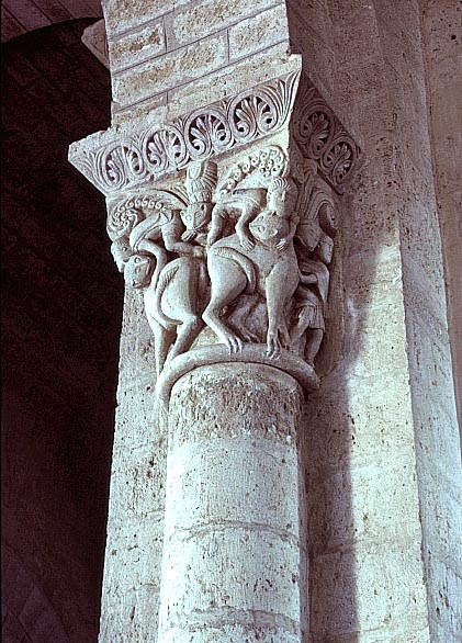 円柱の柱頭には、聖書の物語や空想上の動物が彫刻されている。
