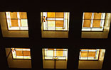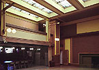 しかし中に入ると、そこにはライト独特の幾何学的な装飾がほどこされ、ガラス屋根の下に嵌められたステンドグラスから落ちる光に満ち、まことに美しいインテリアとなっている。